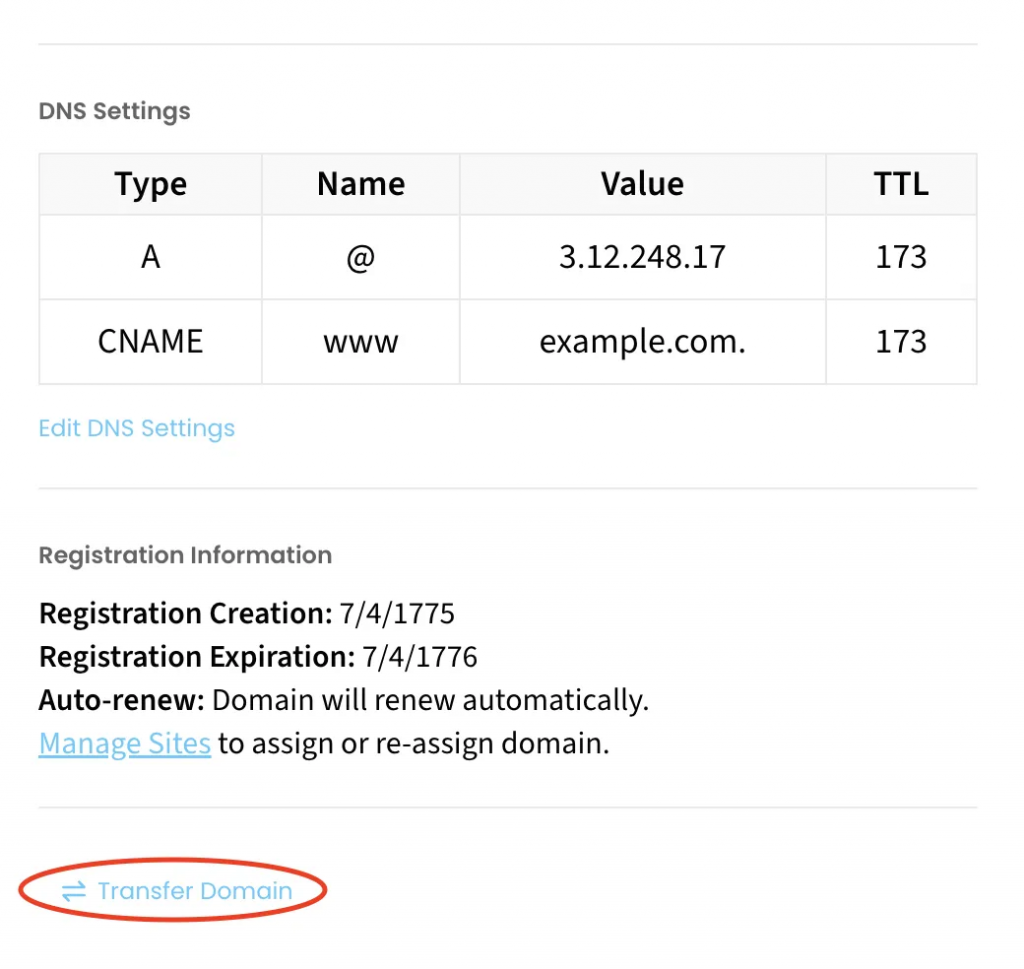 - At the bottom of the popup, click “Transfer Domain”. You can transfer your domain 14 days after registration (a requirement of our registrar).